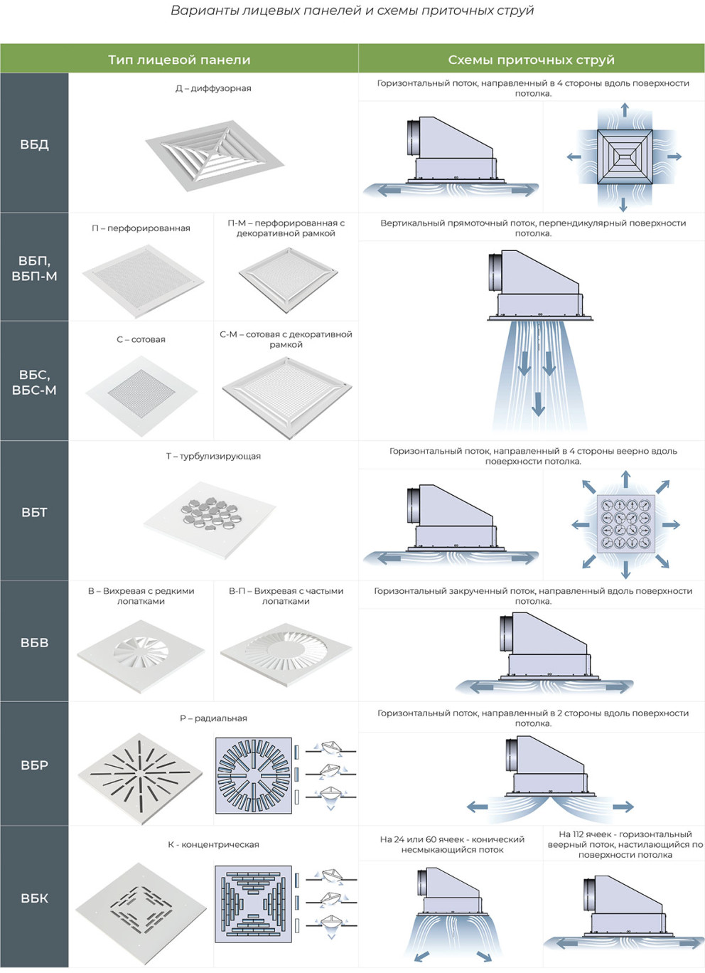 - неоднонаправленный поток воздуха (обеспечивают вихревые воздухораздающие блоки ВБВ; турбулизирующие воздухораздающие блоки ВБТ; радиальные воздухораздающие блоки ВБР; концентрические воздухораздающие блоки ВБК; диффузорные воздухораздающие блоки ВБД);
